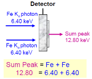 和峰(Sum Peak)是由于2個(gè)光子正好同時(shí)撞擊探測器而產(chǎn)生的偽峰。這2個(gè)光子被探測器捕獲,被識別為1個(gè)光子,如果2個(gè)光子能量相同,則和峰是正常能量的二倍。在具有高元素濃度的XRF光譜中更突出,可以通過降低計(jì)數(shù)率來降低和峰。