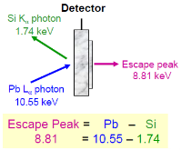 由于探測器中物質(zhì)(如Si)吸收光子的一些能量而引起的偽峰(E觀察到=E入射 - E Si,E Si=1.74 keV)。當(dāng)進(jìn)入探測器的X 射線光子能量高于探測器物質(zhì)的吸收限能量時(shí),因該物質(zhì)對本身被激發(fā)的特征X 射線呈現(xiàn)出高度的透明,而導(dǎo)致這部分能量的逃逸,結(jié)果在能譜上除了入射X 射線的主峰外,還會在較低能量位置出現(xiàn)一個(gè)逃逸峰(Escape peak),在具有高濃度元素和低Z元素的XRF光譜中更突出。
